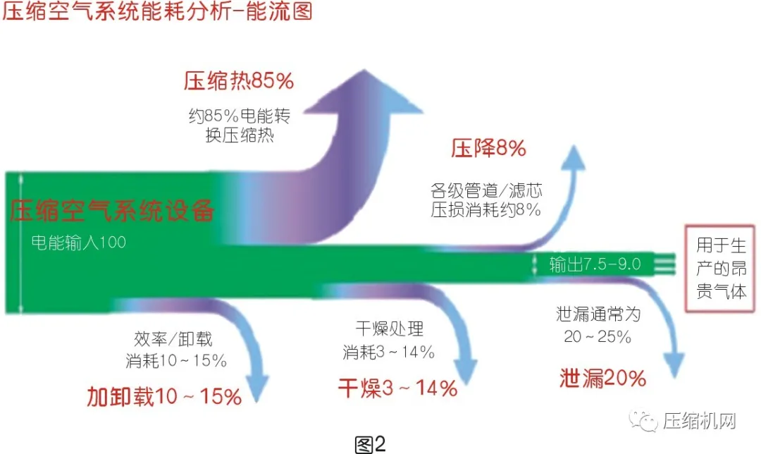 我們來看看壓縮空氣系統(tǒng)的能量流圖(從能量輸入和輸出),如圖2所示。