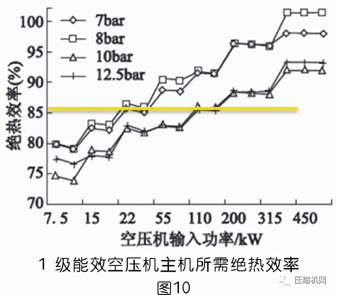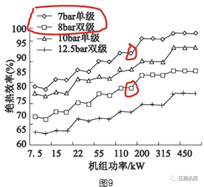 從理論上來說,兩級(jí)壓縮由于級(jí)間壓縮比小,主機(jī)泄露少(壓力低),同時(shí)第二級(jí)進(jìn)氣溫度由于中間冷卻作用變低,因而在相同空壓機(jī)能效限定值,兩級(jí)比單級(jí)壓縮的所需的絕熱效率更低。見圖9為單級(jí)和雙級(jí)壓縮達(dá)到1級(jí)能效時(shí)主機(jī)所需的絕熱效率。