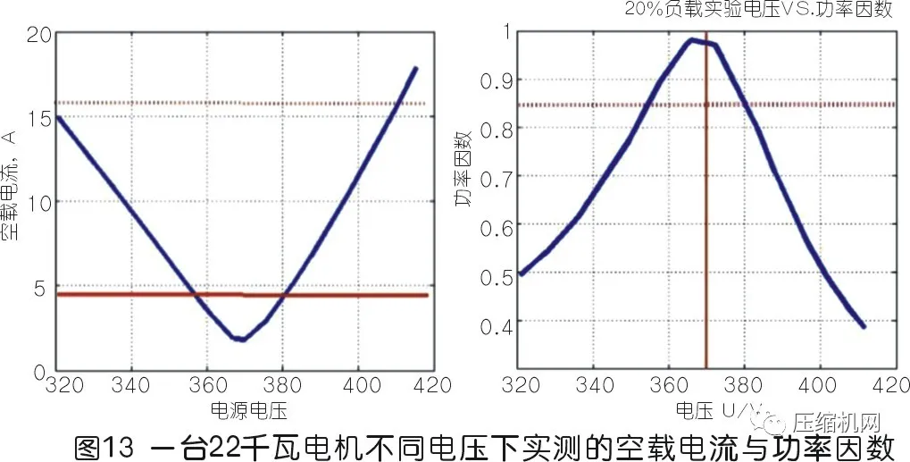 永磁電機(jī)雖然在額定電壓的時(shí)候有很好的節(jié)能效果,但是在實(shí)際用戶現(xiàn)場電壓經(jīng)常會(huì)偏離額定電壓,而當(dāng)電壓大于或者小于感應(yīng)電壓時(shí),電流都會(huì)急劇增大,功率因數(shù)變小,節(jié)能效果大幅度變差。(見圖13)。由圖中可以看出:偏差在±3%電壓范圍內(nèi)時(shí),電機(jī)功率因數(shù)大于或等于0.9,否則,功率因數(shù)較低。