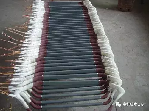 (1)嵌入式繞組鐵芯為開口槽或半開口槽,繞組元件為多匝或單匝成型線圈。當多匝成型線圈用于開口槽時,它們通常被包裹并與地面絕緣。在半開口槽中使用時,線圈由兩根絕緣扁線并聯纏繞而成,在埋入導線時,將它們分離到槽中并在槽中拼接。