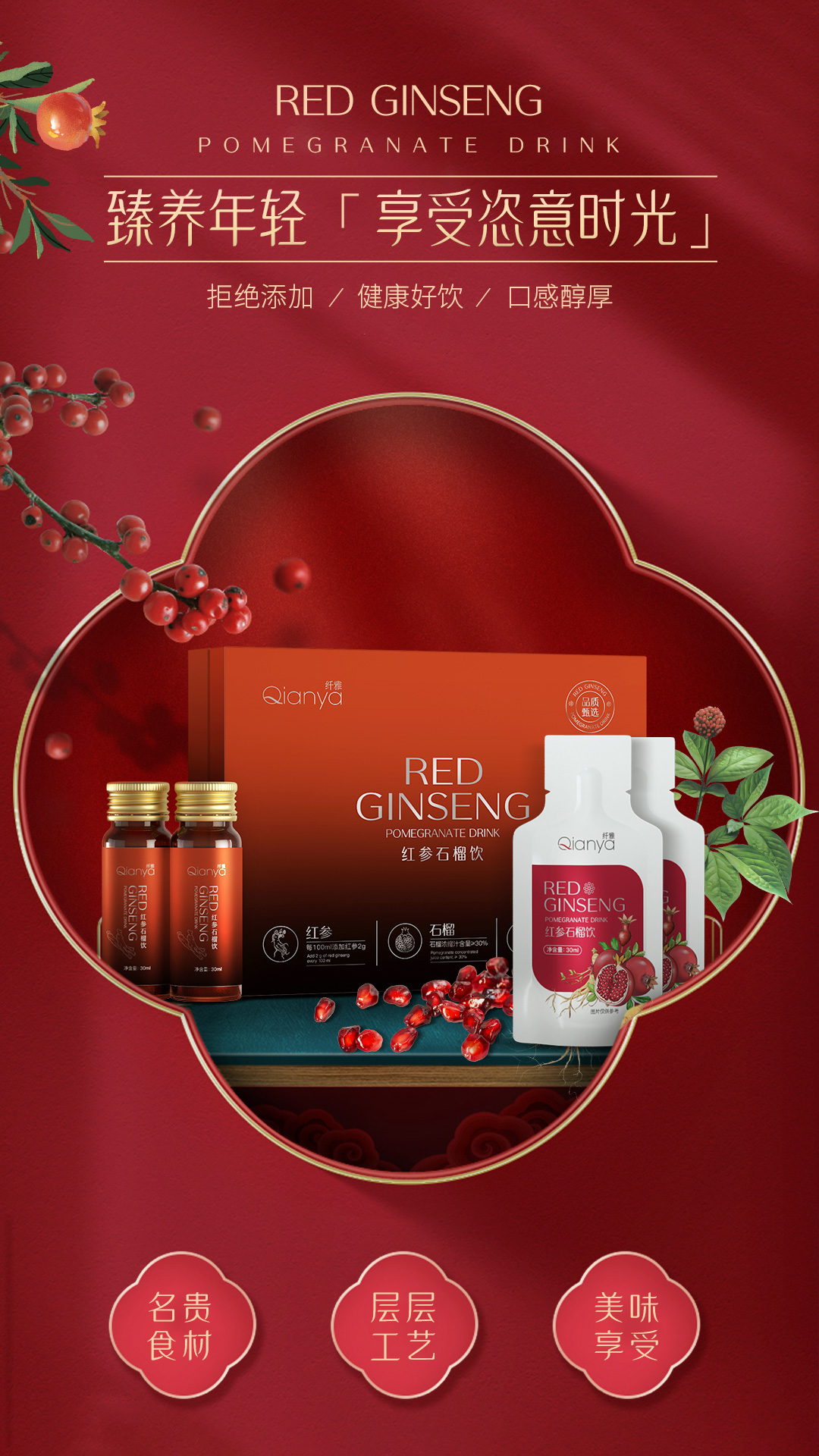 紅參石榴飲品,補(bǔ)精氣神、方便省時(shí),補(bǔ)鐵、補(bǔ)xue氣,三效合一;采用長(zhǎng)白山天然種植的5年紅參,七代傳承的東阿百年堂阿膠