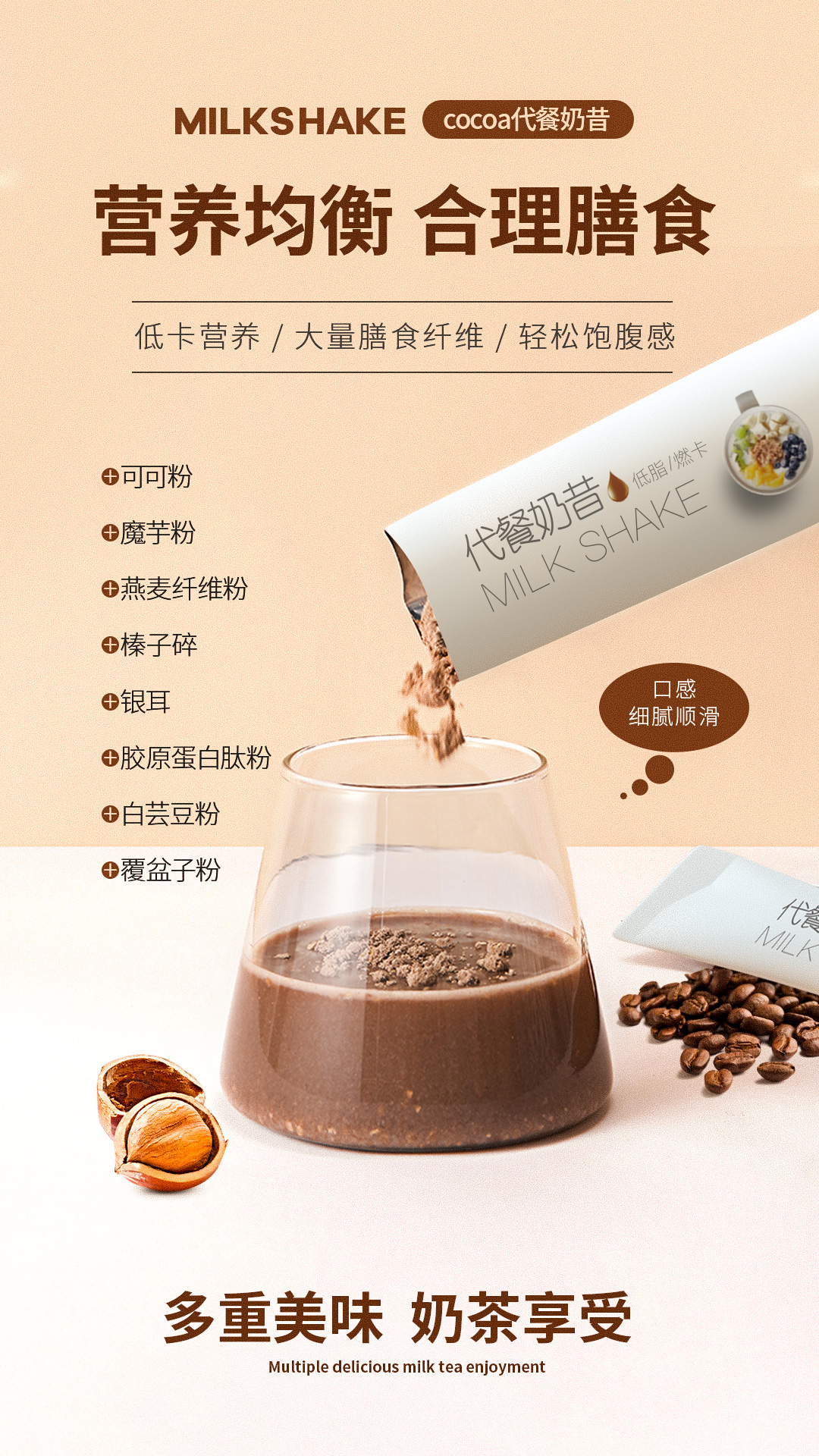 代餐奶昔,輕斷食,重營(yíng)養(yǎng),方便省時(shí);高蛋白,全營(yíng)養(yǎng),低熱量,強(qiáng)飽腹,0蔗糖,減糖不減甜!