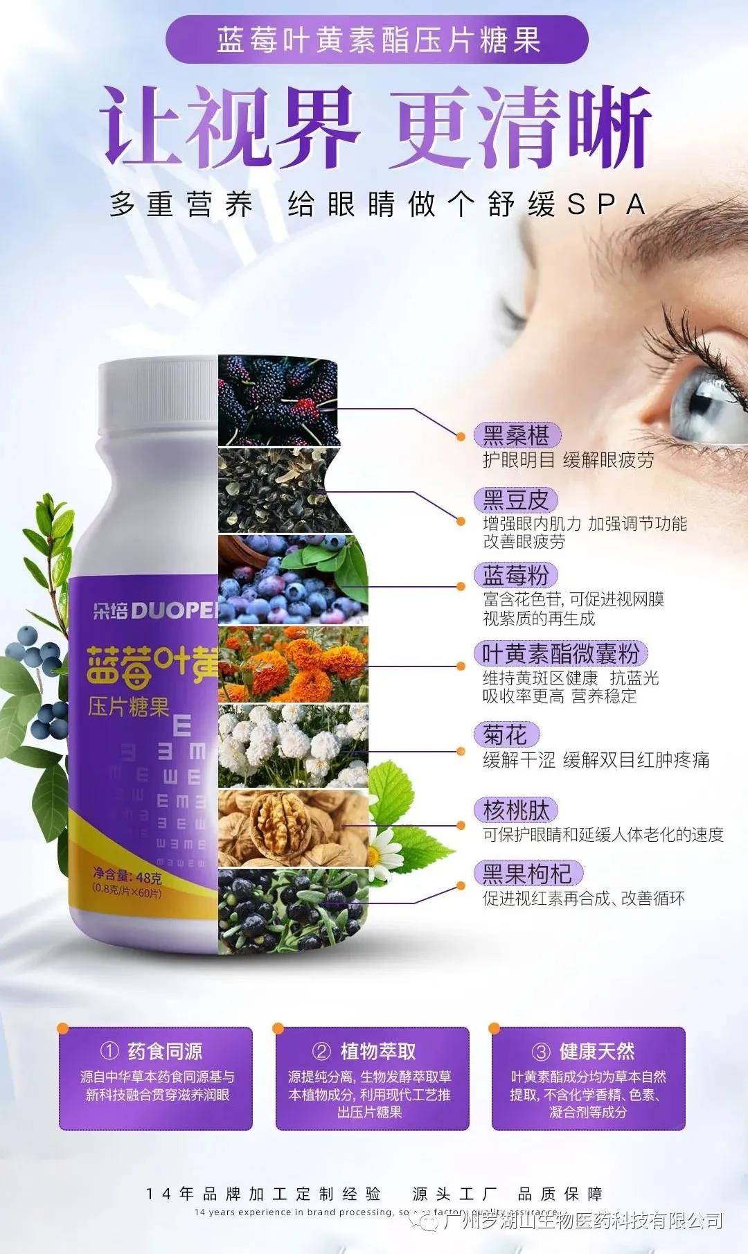 藍(lán)莓葉黃素酯壓片糖果,護(hù)眼養(yǎng)眼,精準(zhǔn)對(duì)抗藍(lán)光;減少自由基對(duì)眼細(xì)胞的損傷,6合1植物精華協(xié)同調(diào)理眼睛健康,3維護(hù)眼配方(補(bǔ)營(yíng)養(yǎng)、抗損傷、抗疲勞),不添加化學(xué)合成色素、防腐劑