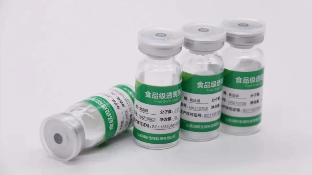在食品添加劑中添加透明質(zhì)酸鈉作為營(yíng)養(yǎng)基用,而口服含透明質(zhì)酸鈉的食品則是為了起到補(bǔ)充機(jī)體水分、改善骨骼關(guān)節(jié)功能、保護(hù)胃黏膜等眾多功效。在食品級(jí)別應(yīng)用中其對(duì)透明質(zhì)酸鈉中純度的要求,相較于醫(yī)藥級(jí)別沒(méi)有那么高,但對(duì)微生物的要求會(huì)高一些。因?yàn)槿梭w消化道極端的PH和其他益生菌的存在,使得其對(duì)蛋白等物質(zhì)不需要做嚴(yán)格的要求也可以充分發(fā)揮其功能,所以對(duì)于食品級(jí)來(lái)說(shuō)其相對(duì)低純度的透明質(zhì)酸鈉就能滿足大部分廠家的需求。