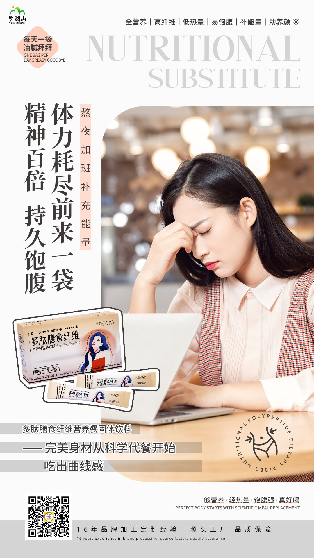 廣州羅湖山生物醫(yī)藥科技有限公司特推出多肽膳食纖維營養(yǎng)餐,富含膳食纖維,添加多種小分子肽,高營養(yǎng),低熱量,強飽腹。