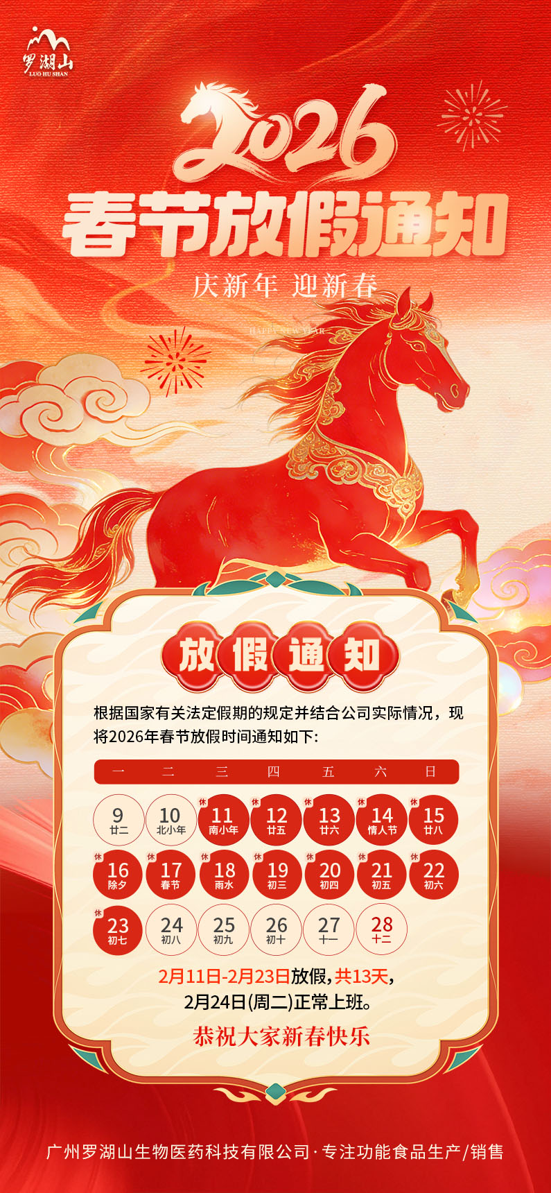 新春將至,我司春節放假安排如下: 放假時間:2026年2月11日(星期三/農歷臘月二十四)至2026年2月23日(星期一/農歷正月初七) 開工時間:2026年2月24日(星期二/農歷正月初八)正式上班