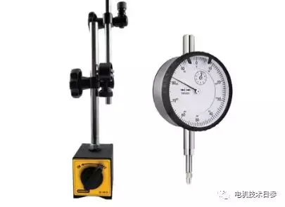緩慢轉動電機軸一周(軸伸檢測應避開鍵槽,以免損壞表頭),記錄儀表指針的最大擺動范圍。上述擺動范圍值是被測軸伸或滑環的徑向圓跳動值。例如,如果指針在0.01毫米和-0.02毫米之間擺動,擺動范圍為0.03毫米,即徑向圓跳動值為0.03毫米。